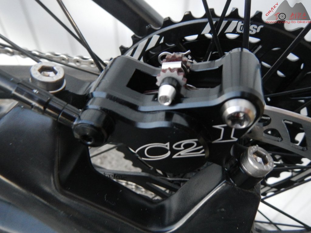 Da das Trailfox 2012 noch nicht über das Type2 Schaltwerk von Sram verfügt, habe ich die BIONICON c.guide v.02 Kettenführung montiert. Mit gerade mal 20 g hält diese die Kette sicher, wo sie hingehört - und passt in "gold" (eigentlich orange) perfekt zu den orangefarbenen Hinterbaugelenken.