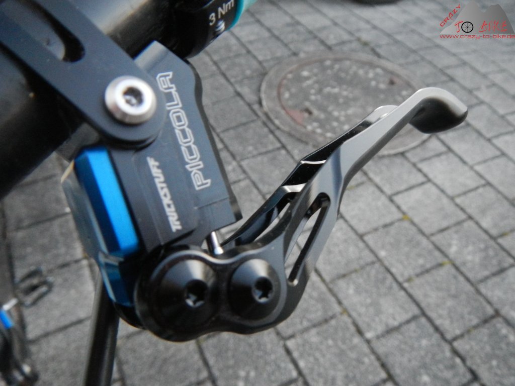 Da die Trickstuff Dächle UL, die ich zusammen mit der gesamte Trickstuff Picola Bremsanlage vom BMX Trailfox TF01 übernommen habe, verschlissen waren und deshalb gewechselt werden mussten, habe ich die noch im Ersatzteillager befindlichen Trickstuff Dächle HD montiert. Diese sind durch mehr Material etwas schwerer als die UL, deshalb aber auch noch etwas standfester bei langen, steilen Abfahrten.