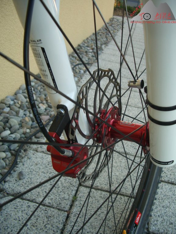 Trotz normalerweise sorgfältigem Vorgehen beim Anziehen von Schrauben passiert mir das Malheur: 2 Tage vor der Abfahrt zum Gardasee überdrehe ich das Magnesium-Gewinde der PM-Scheibenbremsenaufnahme an meiner Manitou Black Super Air. Dank längerer Schraube und 2-Komponentenkleber überlebt das Ganze eine Woche Gardasee-Trails ohne Probleme - auf Dauer ist das aber keine Lösung. Daher wurde die Black durch eine Rock Shox SID Race mit Poplock ersetzt.