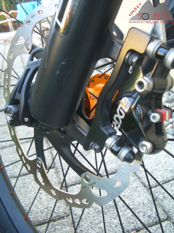 Unglaublich aber wahr - die aktuellen Avid Elixir Bremsen sind extrem hitzeanfällig. Schon kleine Abfahrten führen dazu, dass die Bremse zu stinken beginnt - kein vertrauenerweckender Zustand. Ich habe daher die original Avid Scheiben (180/180 mm) gegen Shimano XT Icetec Scheiben (203/180 mm) und die original Avid-Beläge gegen Trickstuff getauscht. Nun macht die Bremsanlage wieder das, was sie soll: Klaglos bremsen.