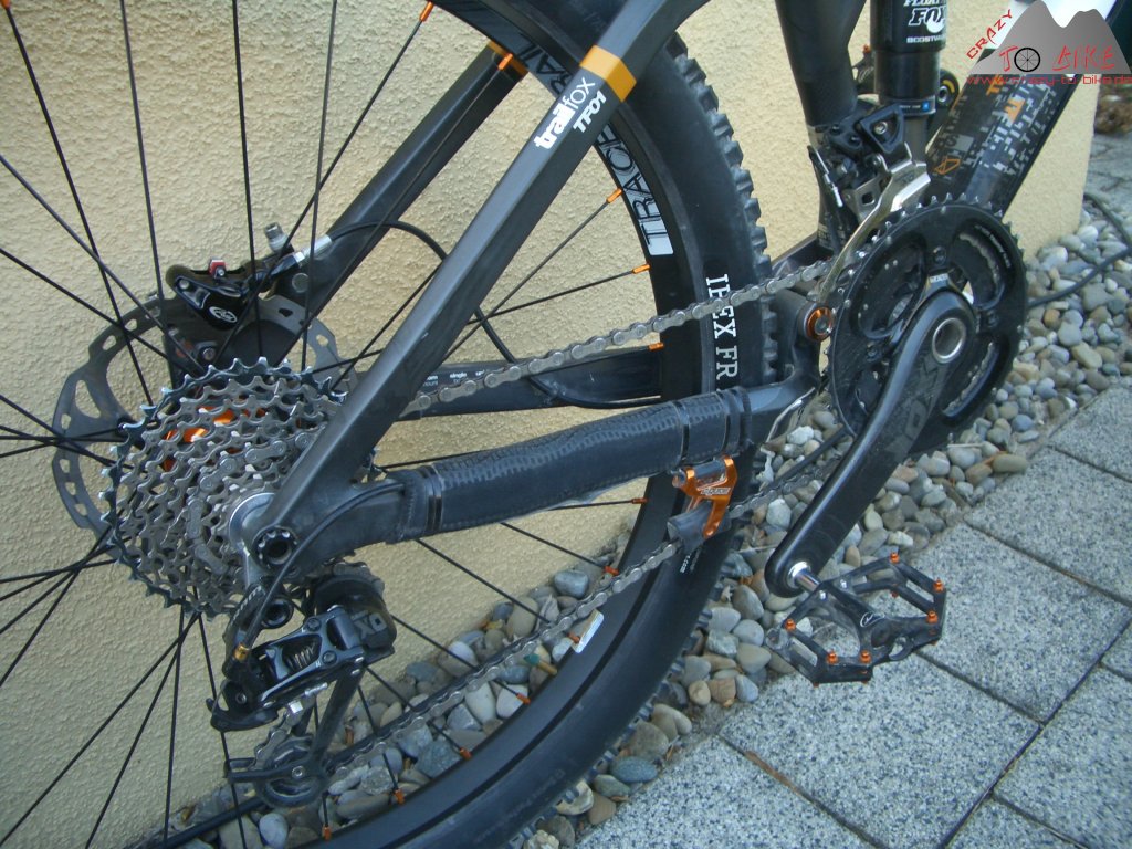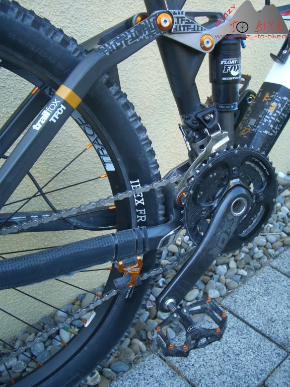Da das Trailfox 2012 noch nicht über das Type2 Schaltwerk von Sram verfügt, habe ich die BIONICON c.guide v.02 Kettenführung montiert. Mit gerade mal 20 g hält diese die Kette sicher, wo sie hingehört - und passt in "gold" (eigentlich orange) perfekt zu den orangefarbenen Hinterbaugelenken.